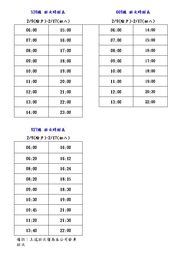 | 539 | 依例假日班次發車 | ||||||||||||||||||