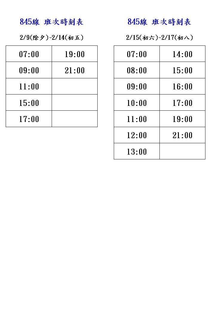 | 845 | 參閱發車時刻表 | 依例假日班次發車 | |||||||||||||||||