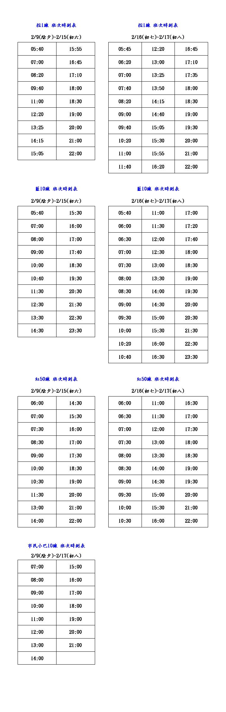 | 藍10 | 參閱發車時刻表 | 依例假日班次發車 | |||||||||||||||||