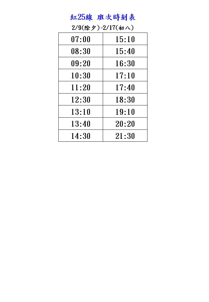 | 紅25 | 依例假日班次發車 | ||||||||||||||||||