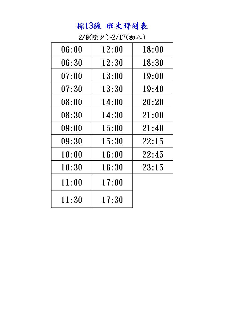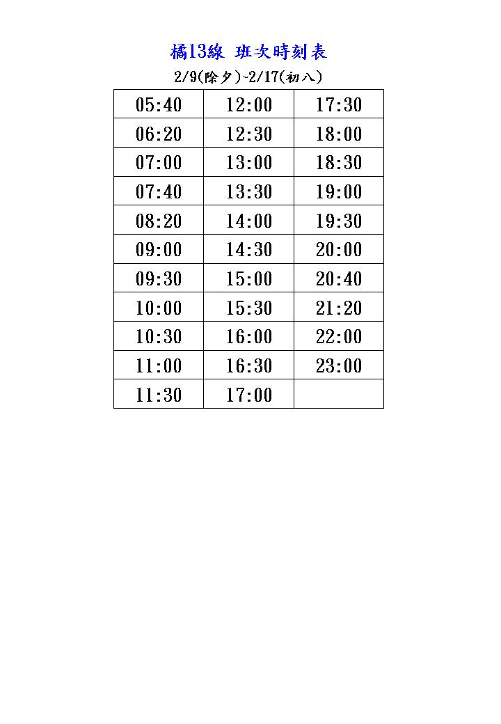 | 橘13 | 依例假日班次發車 | ||||||||||||||||||