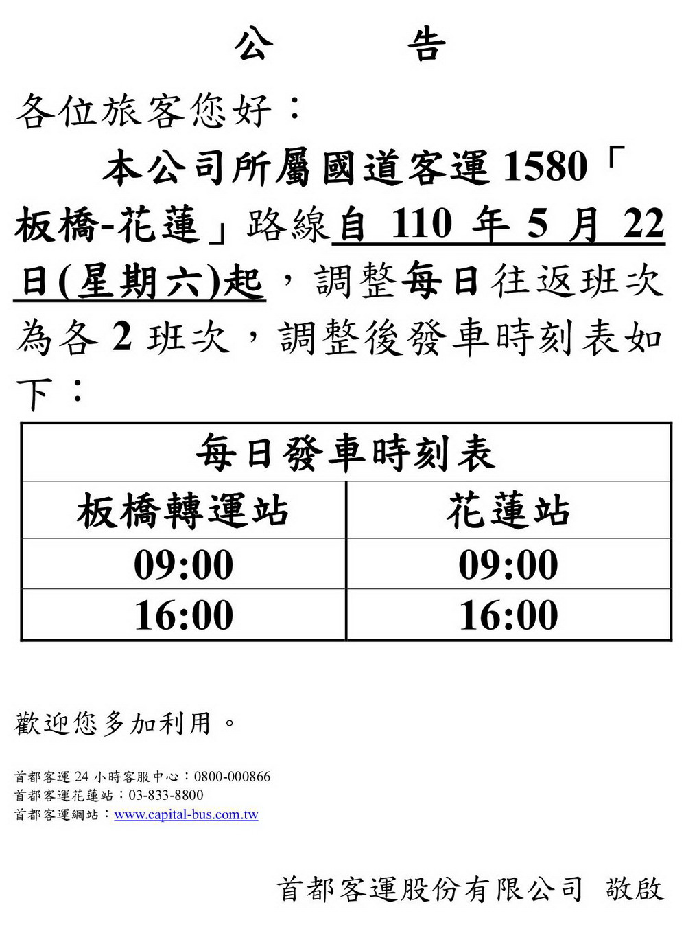 首都客運客服中心(24小時全年無休)免付費電話:0800-000-866