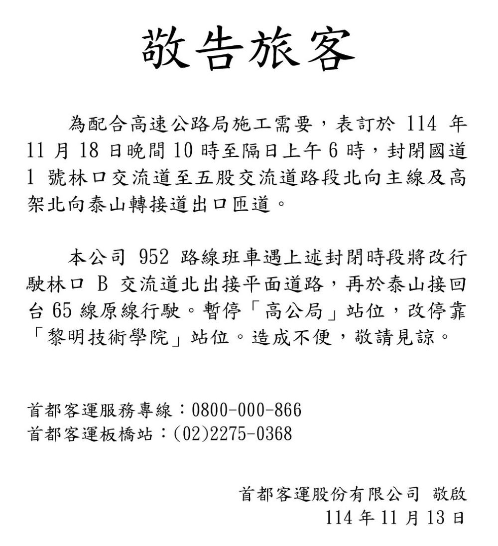 首都客運客服中心(24小時全年無休)免付費電話:0800-000-866