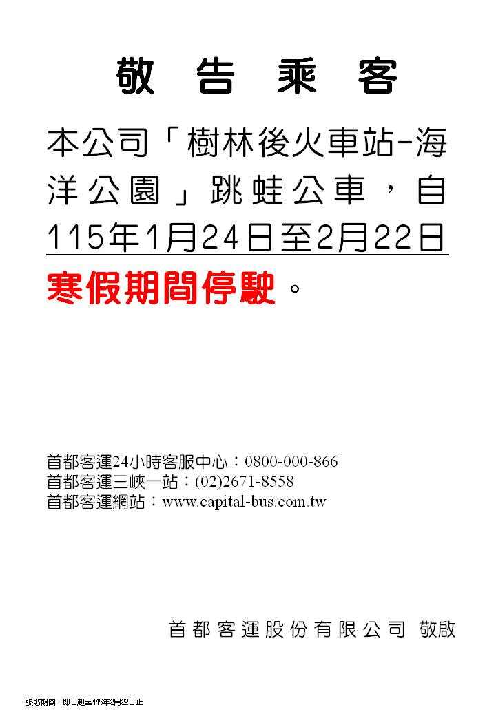 首都客運客服中心(24小時全年無休)免付費電話:0800-000-866