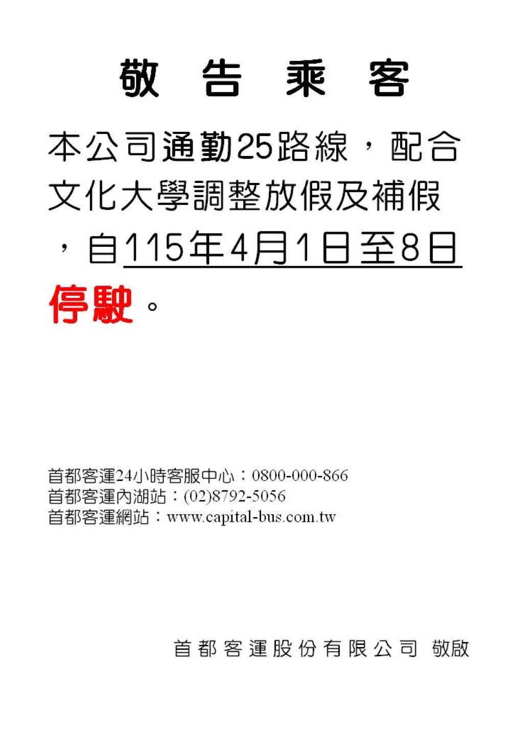 首都客運客服中心(24小時全年無休)免付費電話:0800-000-866