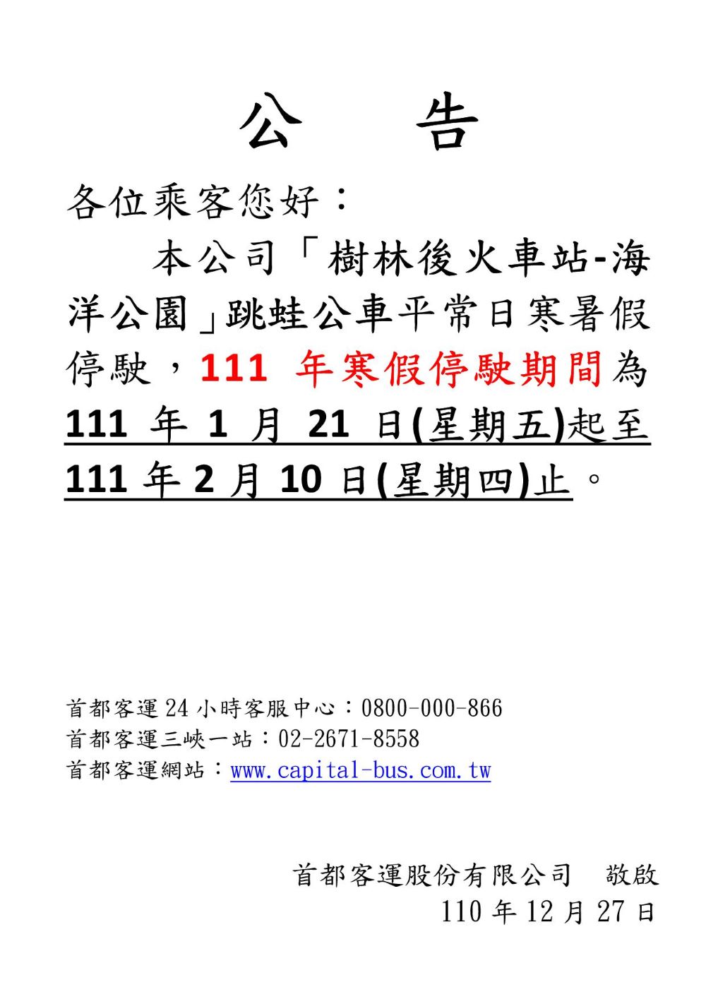 首都客運客服中心(24小時全年無休)免付費電話:0800-000-866