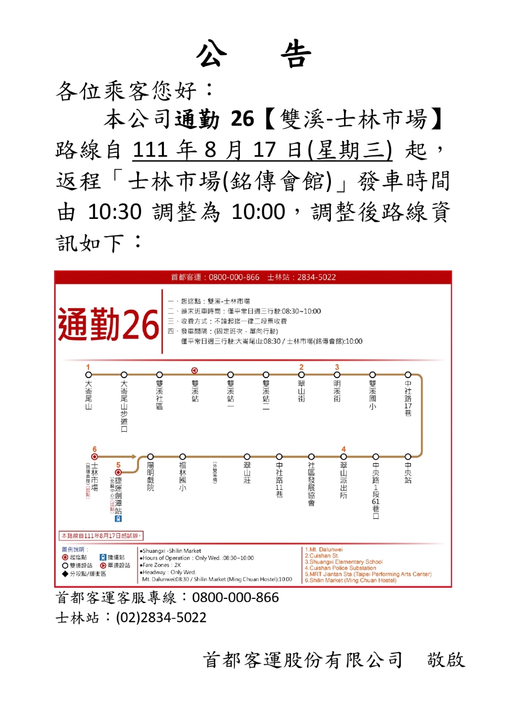 首都客運客服中心(24小時全年無休)免付費電話:0800-000-866