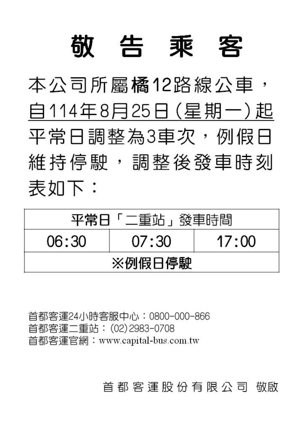 首都客運客服中心(24小時全年無休)免付費電話:0800-000-866