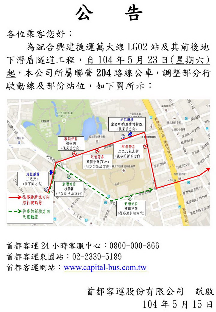 為配合興建捷運萬大線LG02站及其前後地下潛盾隧道工程,自104年5月23日(星期六)起,本公司所屬聯營204路線公車,調整部分行駛動線及部份站位
