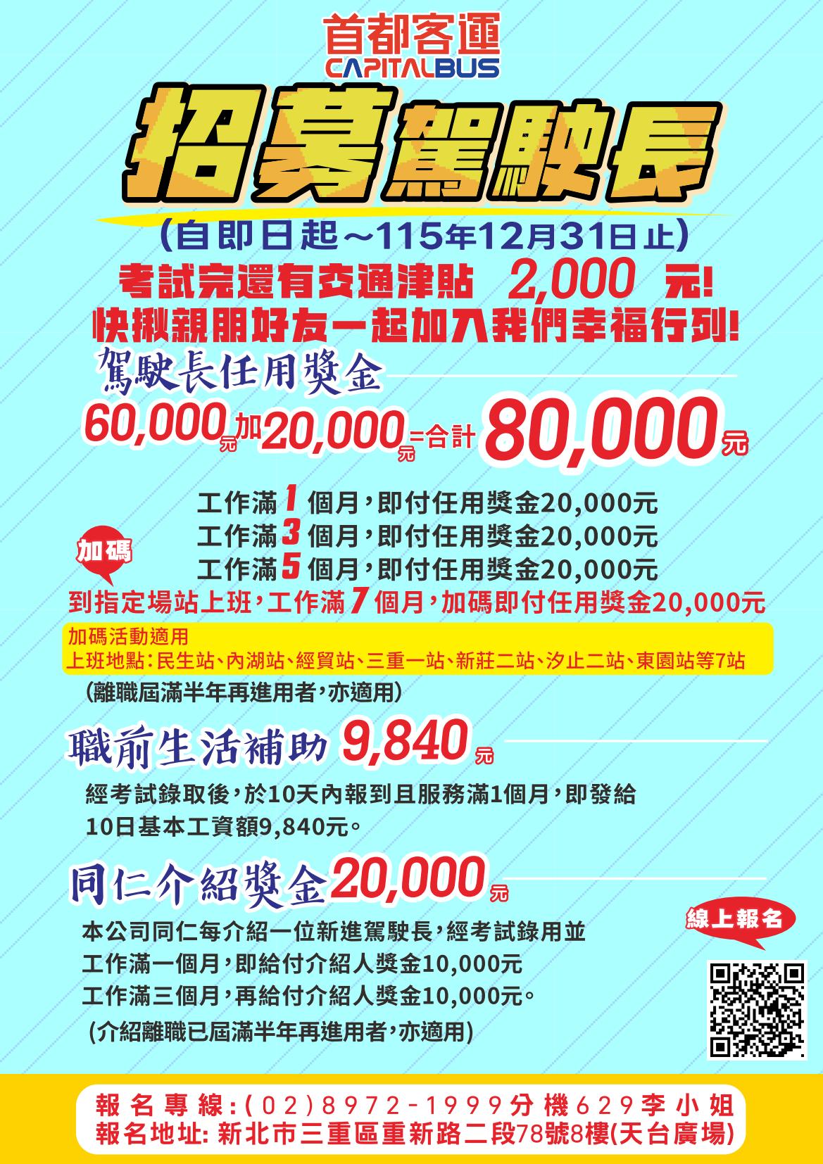 》應徵條件:持有職業大客車或職業聯結車駕照及大型車職業駕駛人定期訓練證明並可配合輪班者。 》工作內容:公車駕駛長 》工作地點:新北市、臺北市、宜蘭縣 》福利優良環境佳、人性化管理、提供員工免費健檢、年節及年終獎金發放 》薪資:面議(含加班費58,000元以上) 報名方式: 1.臨櫃報名:請攜帶身分證、駕照、定期訓練證明 2.網路報名:請點選「線上報名」,登錄資料 3.電話報名 |